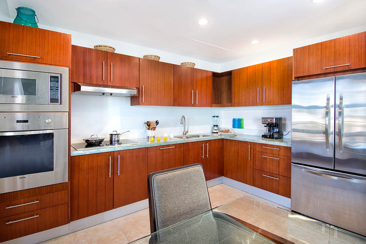 - The impeccable kitchen features granite countertops and is equipped with deluxe stainless steel Viking appliances, triple door refrigerator, stove, oven, microwave, dishwasher, coffee maker, blender, toaster and a full supply of china, glasses, cooking utensils, crockery and pots.