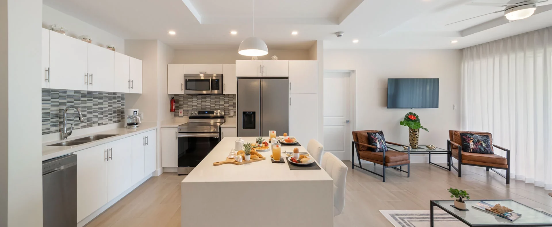 The kitchen’s inviting island beckons for leisurely morning gatherings over breakfast, creating cherished moments with loved ones.