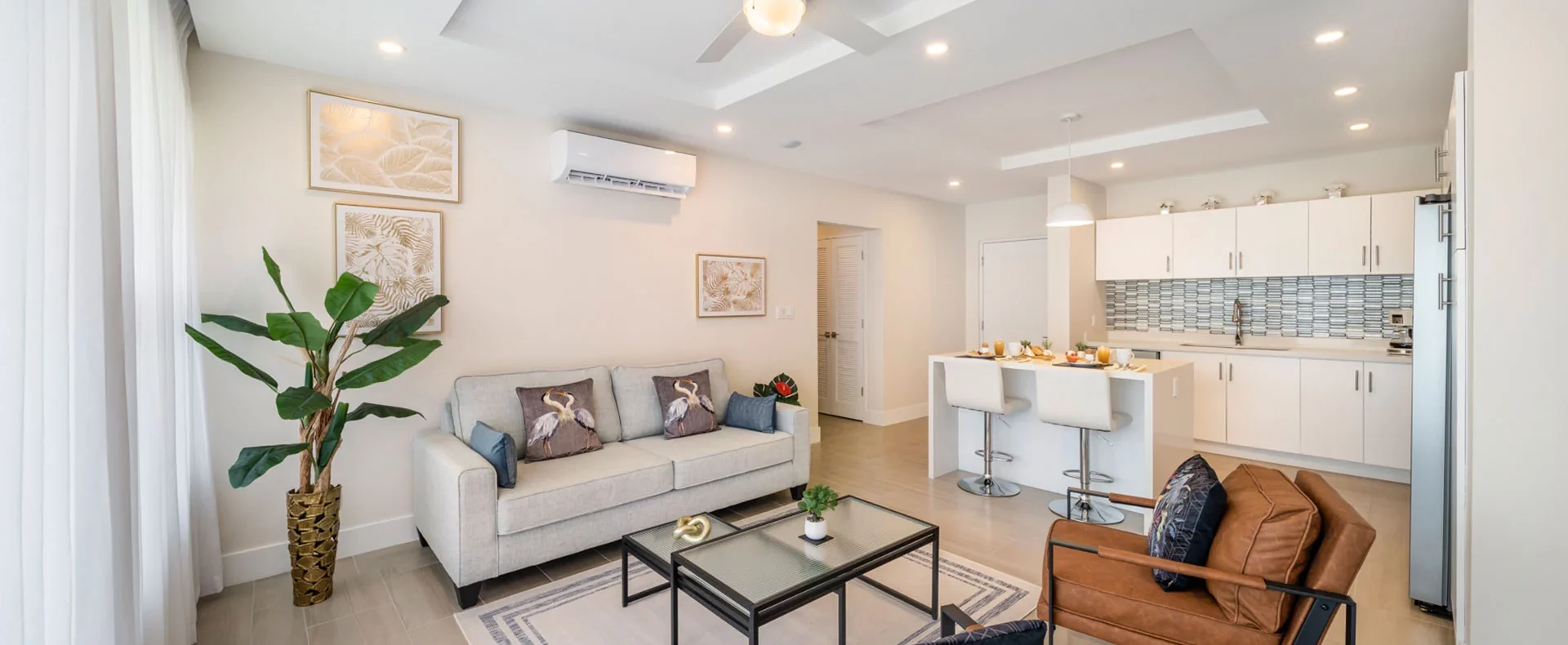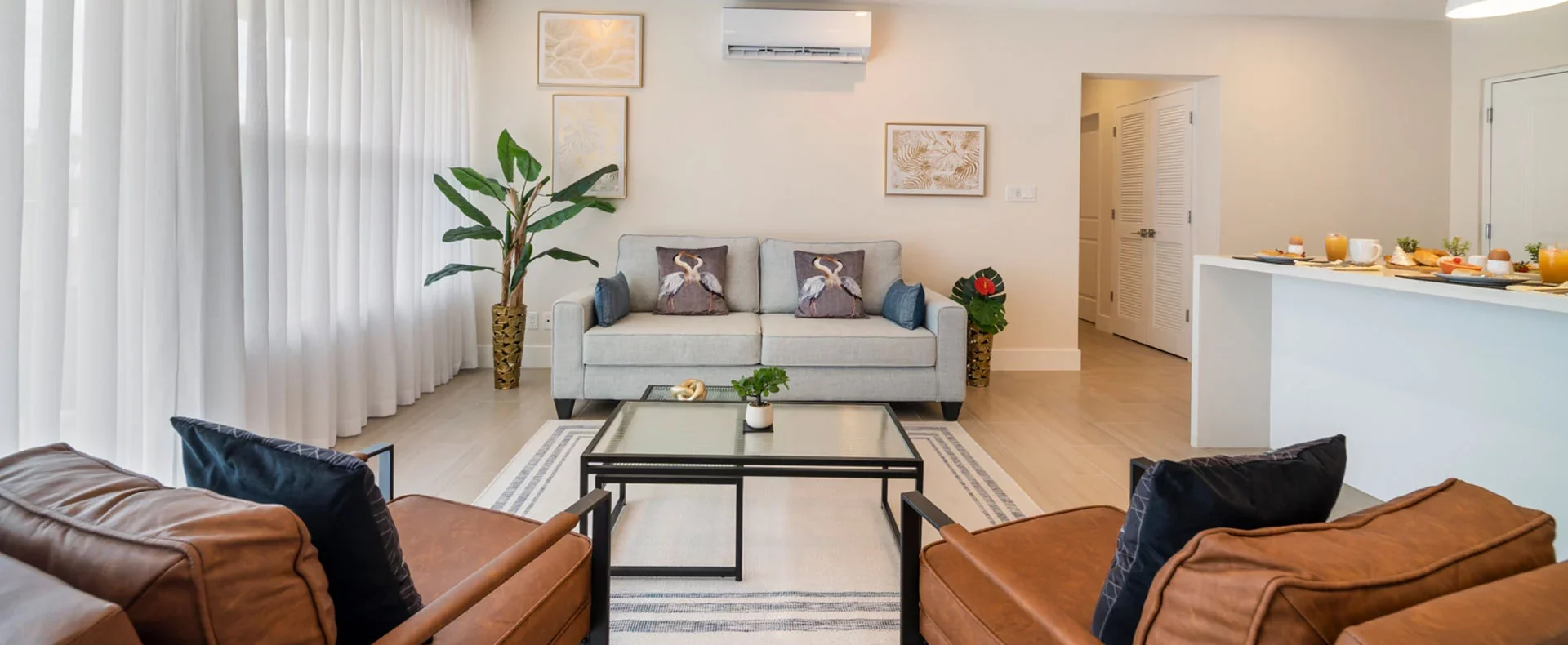 As you enter, the airy open-style layout welcomes you, showcasing a modern aesthetic with chic decor in soothing hues of blue and accents of radiant gold.