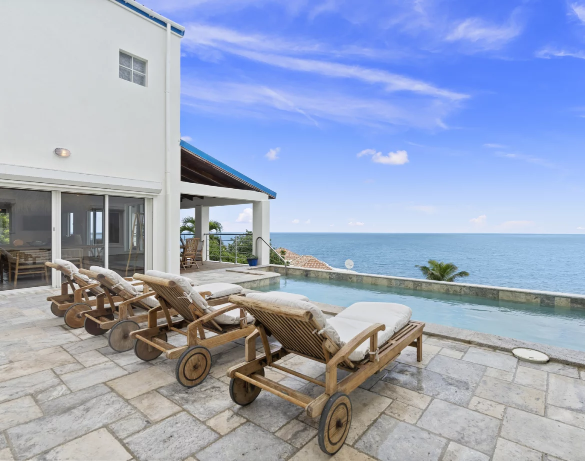 Discover the boho-chic elegance in this 6-bedroom, 5-bathroom villa located within Dawn Beach Estate’s gated community.