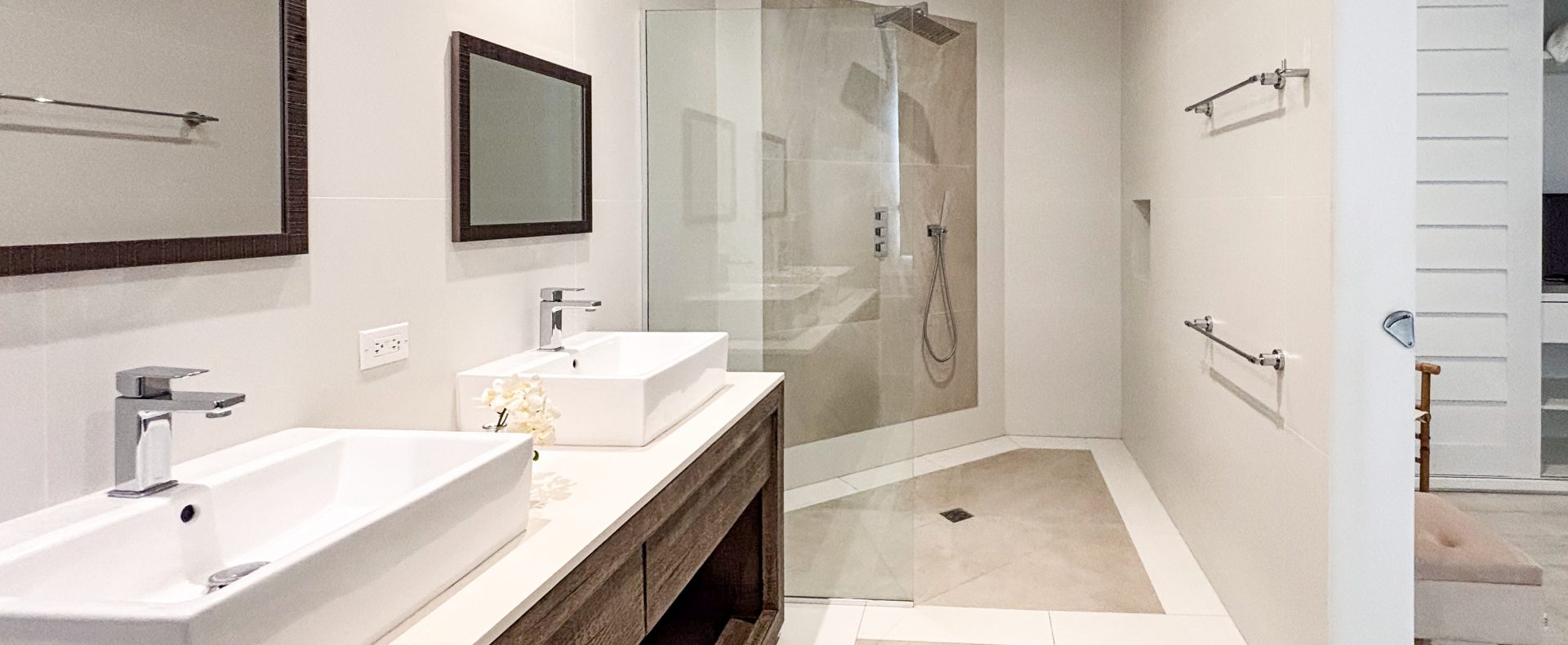 Both bedrooms are air-conditioned, providing a cool, tranquil retreat. The primary suite is particularly inviting featuring a television within the suite and a large ensuite bathroom with double vanity sinks and a spacious walk-in shower. Thoughtfully finished in calming neutral tones and natural textures, the apartment exudes a contemporary yet comfortable aesthetic.