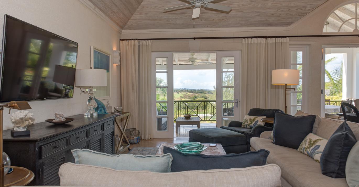 An open plan living, and dining area can be found on the upper level of the villa, leading out to a spacious covered balcony where guests can relax and enjoy a delicious Barbadian meal, dining alfresco.