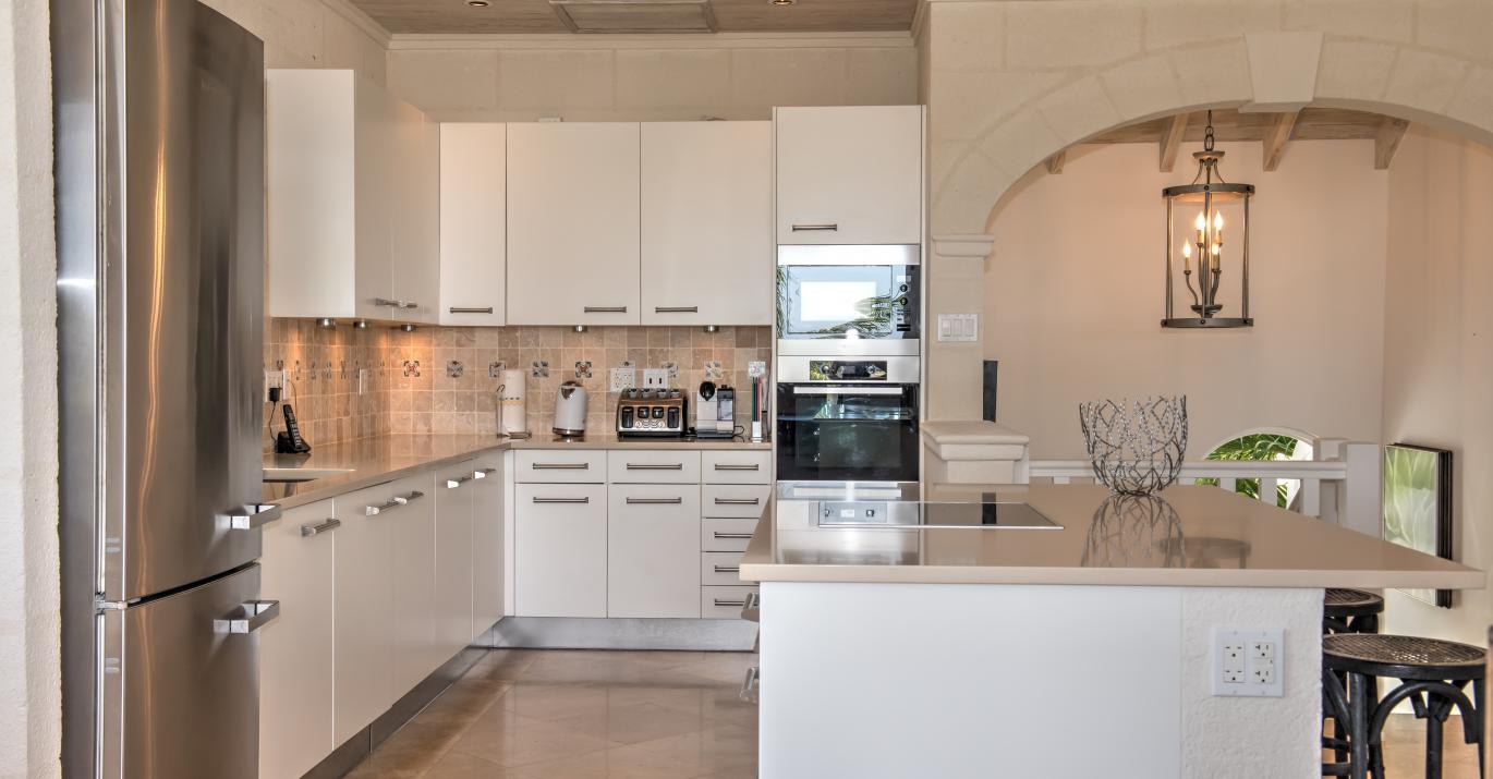 The modern kitchen is fully equipped with top-of-the-line appliances, beautifully balancing a sleek modern look with the warm ambiance of the villa.